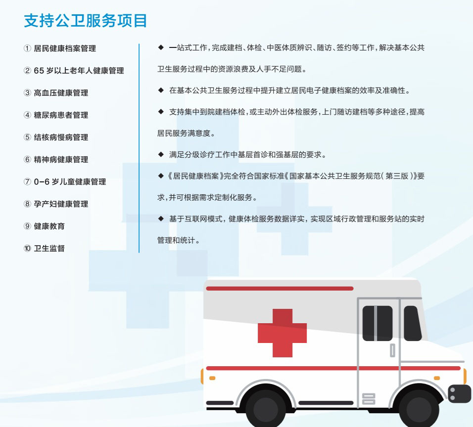 支持國家公衛(wèi)體檢,《居民健康檔案》完全符合國家標(biāo)準(zhǔn)《國家基本公共衛(wèi)生服務(wù)規(guī)范(第三版)》要求。